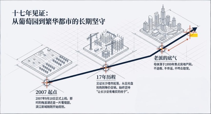 此刻坐在电脑前写这封信,窗外是长沙三月的烟雨,脑海里浮现的却是十七年前的画面。那时候梅溪湖还是一片葡萄园,滨江新城刚刚开始规划,很多现在我们耳熟能详的房企品牌还没有进驻长沙。而搜狐焦点长沙站,就在那一年——2007年9月18日正式上线了。