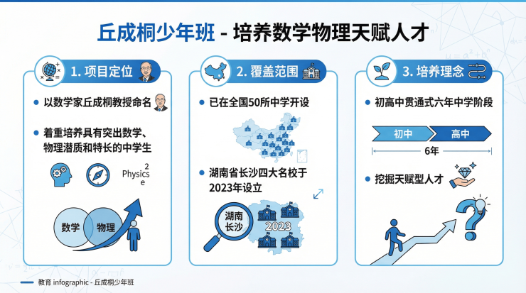 丘成桐少年班由清华大学求真书院统筹指导,旨在培养数学等基础学科拔尖创新后备人才,入选学生主要目标是通过"新领军"计划进入清华大学。目前,长沙雅礼集团、长郡集团、师大附中集团、市一中集团均已获得丘班授权,其初中部邱班承担的职能是为集团高中部选拔和输送具有学科竞赛潜质的顶尖人才。