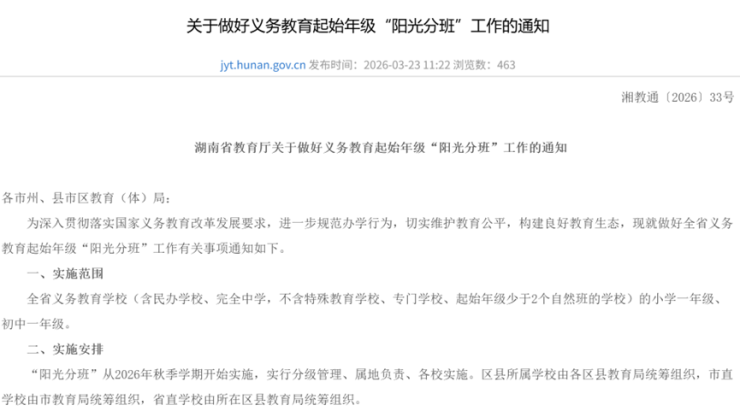 近日,湖南省教育厅发布通知,明确自2026年秋季学期起,全省义务教育起始年级全面实施"阳光分班"。